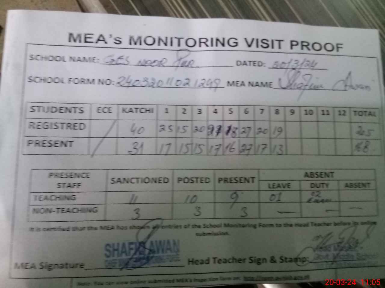 | Attendance Register | Head Teacher | MEA with School | Visit Proof |