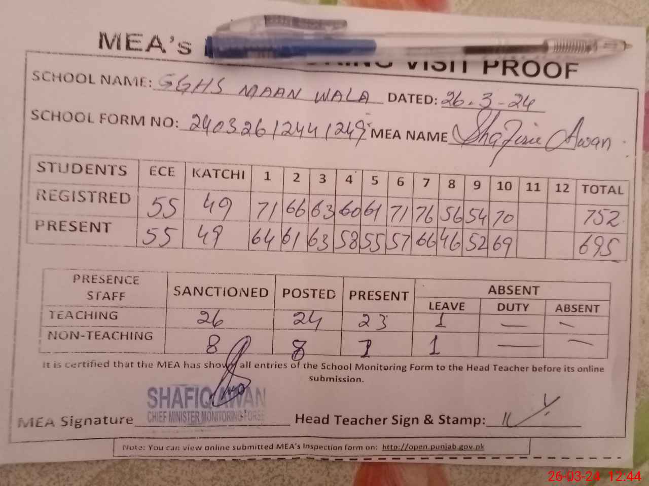 | Certified that this School was Inspected by the Undersigned MEA/DMO Today and the Information Stated Above is as Per Record. | |||||