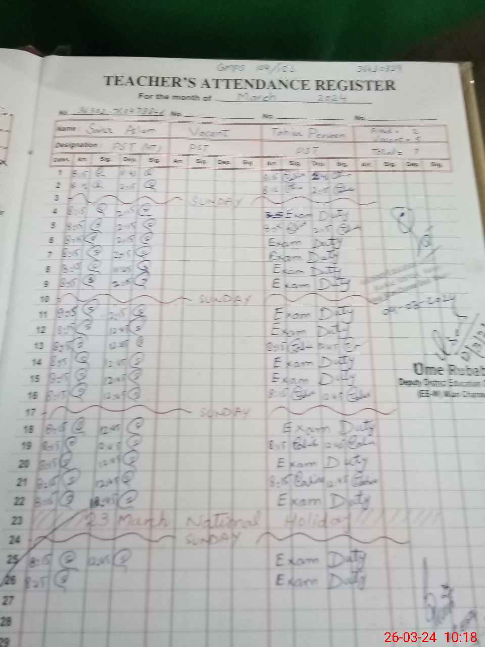 | 36**** | Ta**** Pe**** | PST | Regular | 1 | 0 | 0 | 0 | 0 | 0 | 0 | 0 | 1 | Exam Duty |