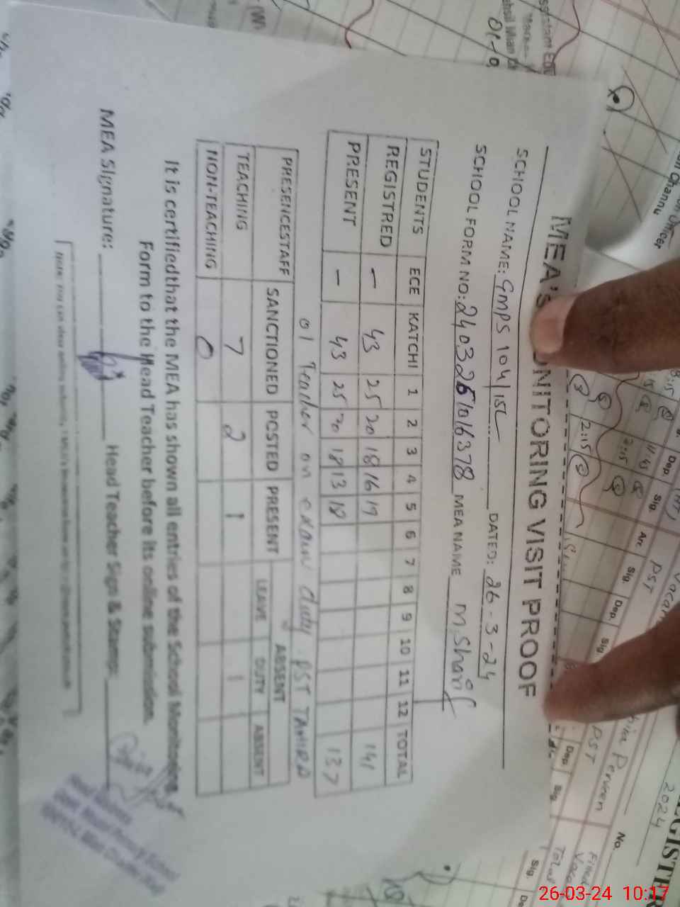 | Attendance Register | Head Teacher | MEA with School | Visit Proof |