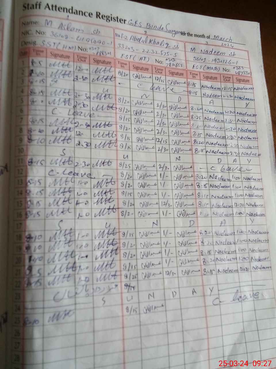 | CNIC | Full Name | Designation | R/C | Absence During Last Calender Month |