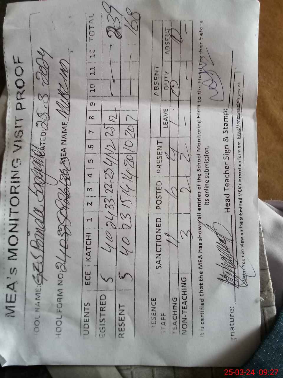 | Attendance Register | Head Teacher | MEA with School | Visit Proof |