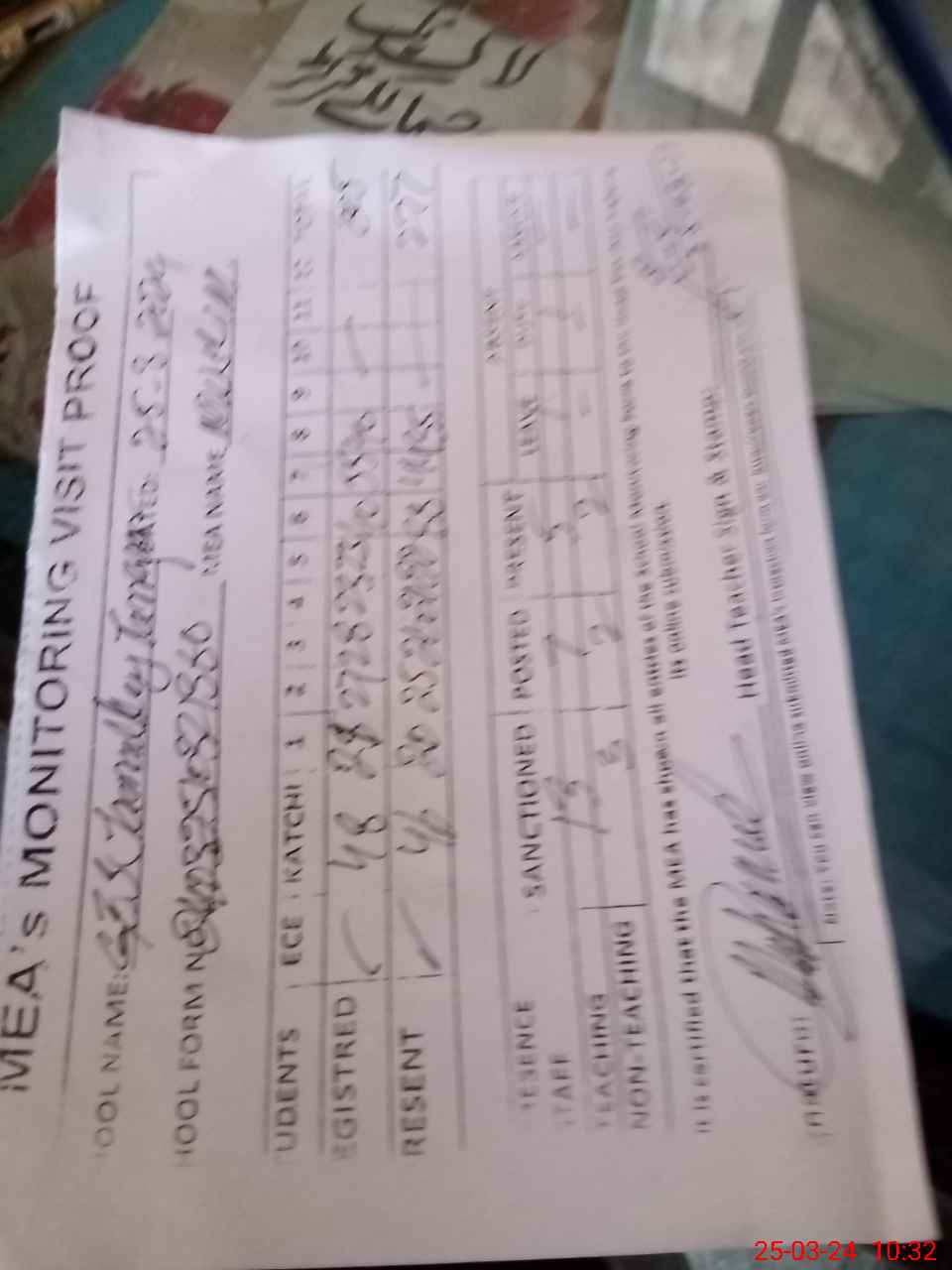 | Attendance Register | Head Teacher | MEA with School | Visit Proof |