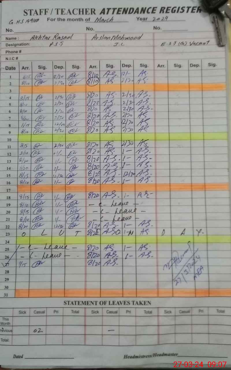 | 36**** | Mu**** Ra**** Al**** Kh**** | SST | Regular | 0 | 0 | 0 | 0 | 0 | 0 | 0 | 0 | 0 | Exam Duty |