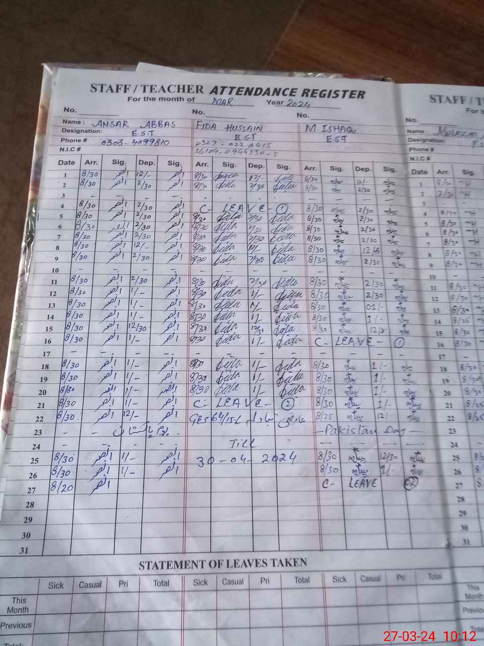 | CNIC | Full Name | Designation | R/C | Absence During Last Calender Month |
