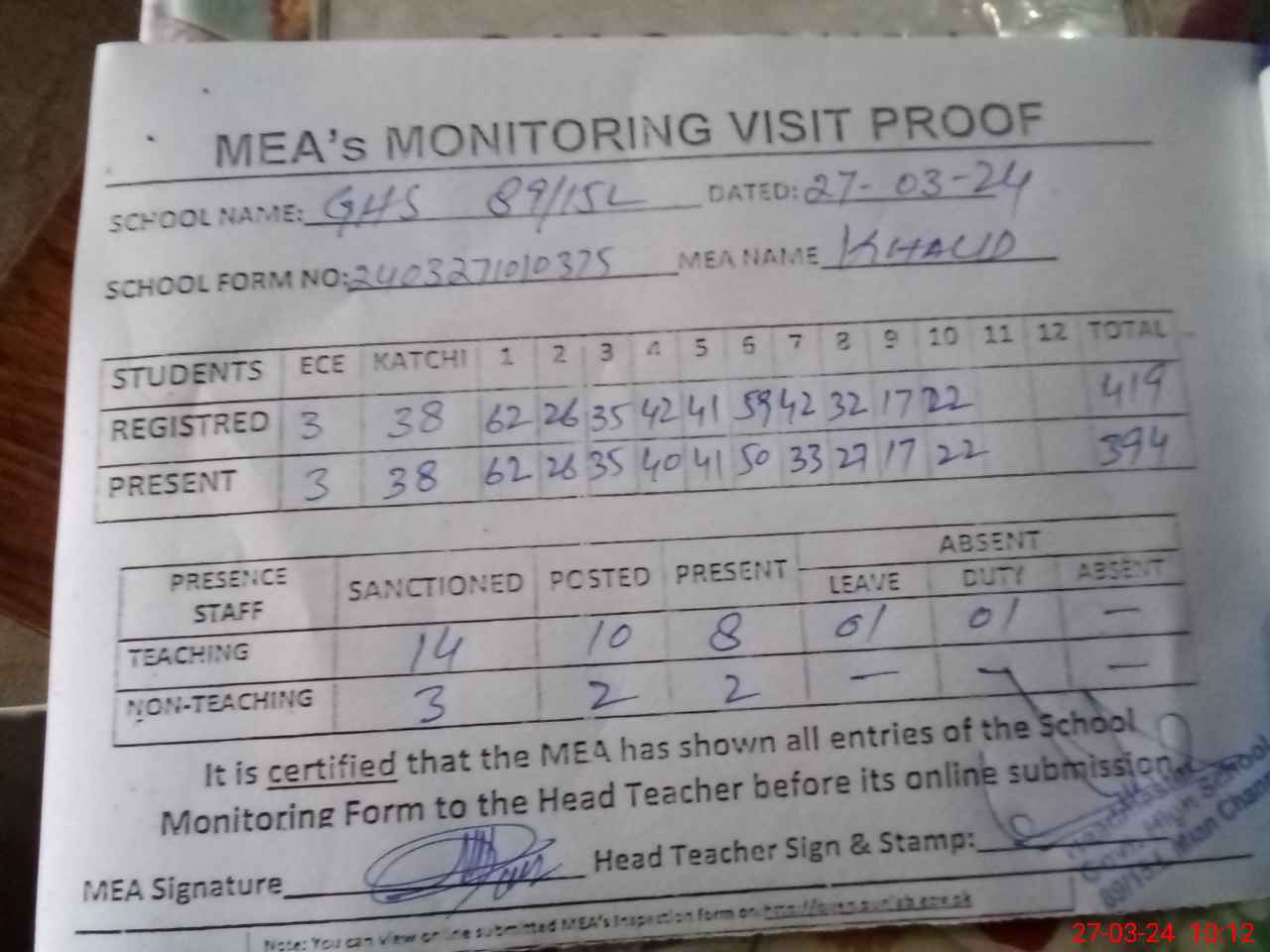 | Attendance Register | Head Teacher | MEA with School | Visit Proof |