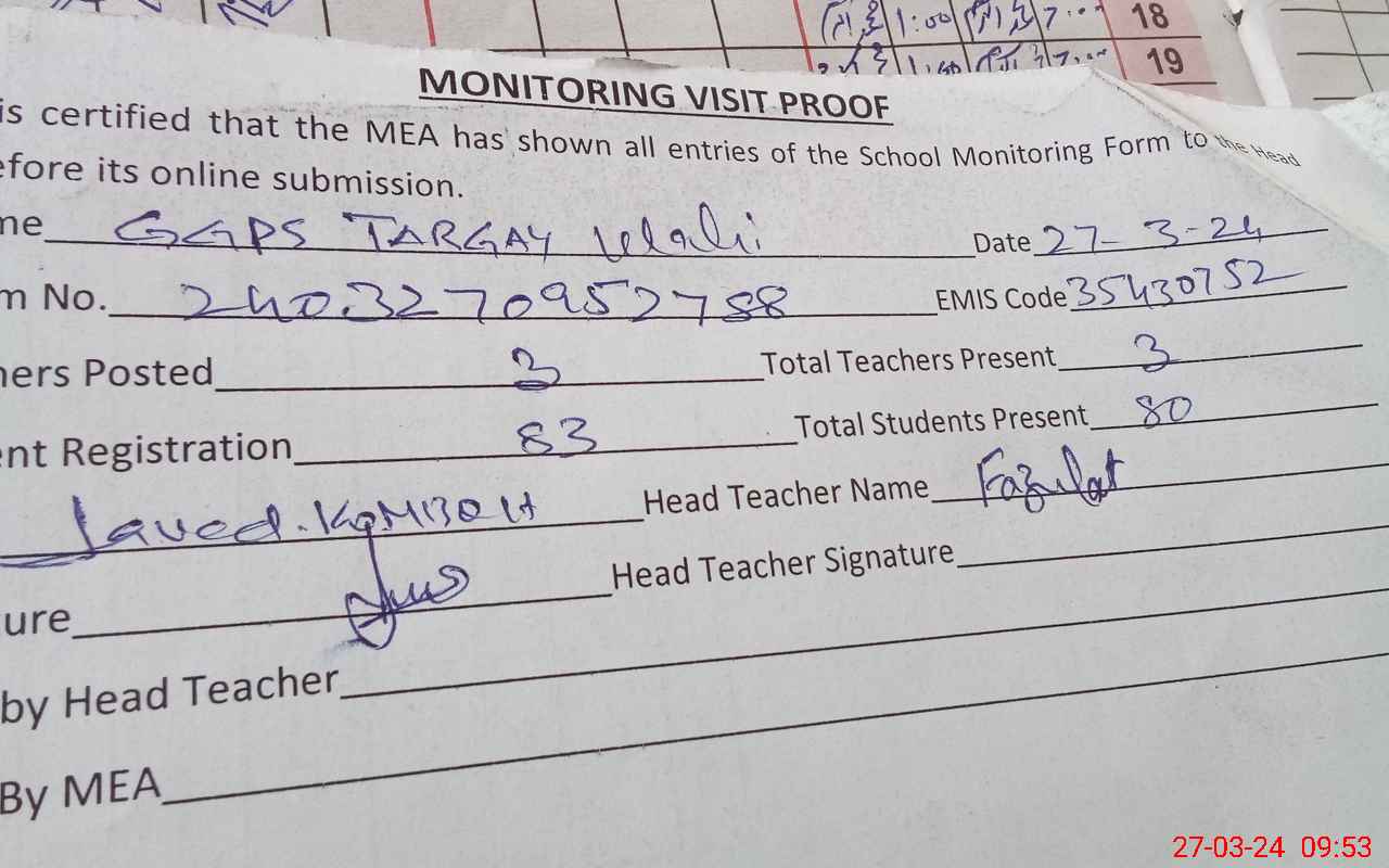 | EMIS Code: 35430752 | Name of School: GGPS TARGAY WALI | |||