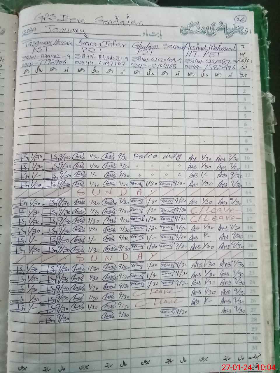 | Leave | Duty | Absent | Maternity | Medical | Ex- Pak |