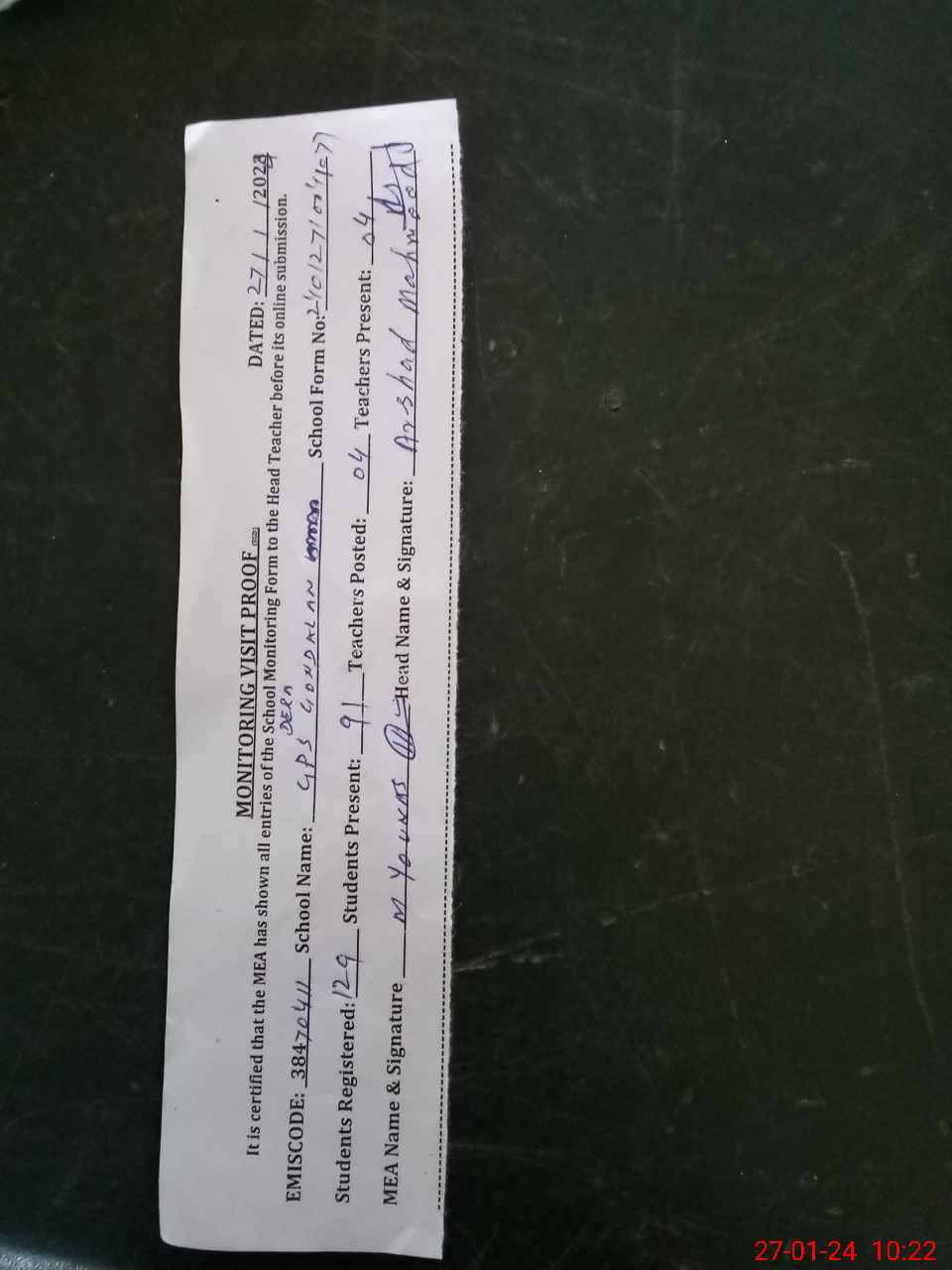 | Attendance Register | Head Teacher | MEA with School | Visit Proof |