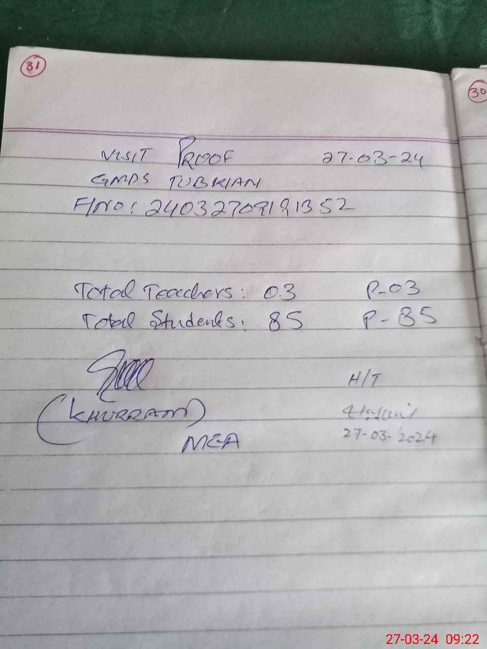 | Attendance Register | Head Teacher | MEA with School | Visit Proof |