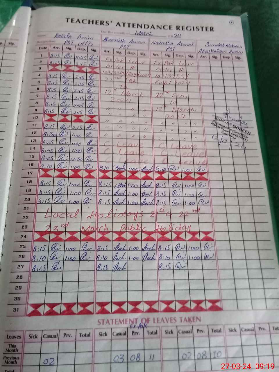 | Leave | Duty | Absent | Maternity | Medical | Ex- Pak |