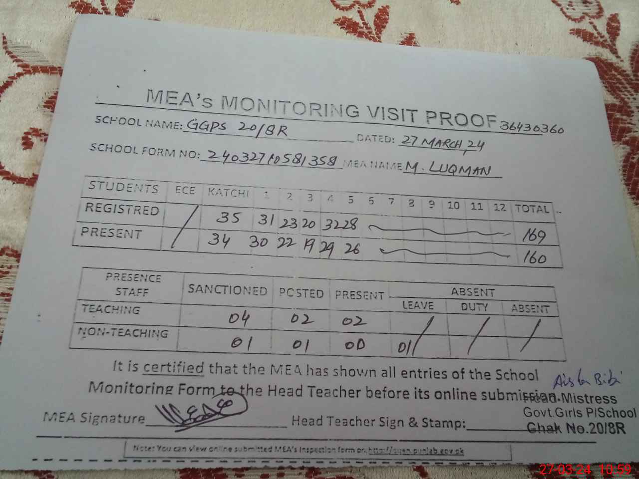 | Attendance Register | Head Teacher | MEA with School | Visit Proof |