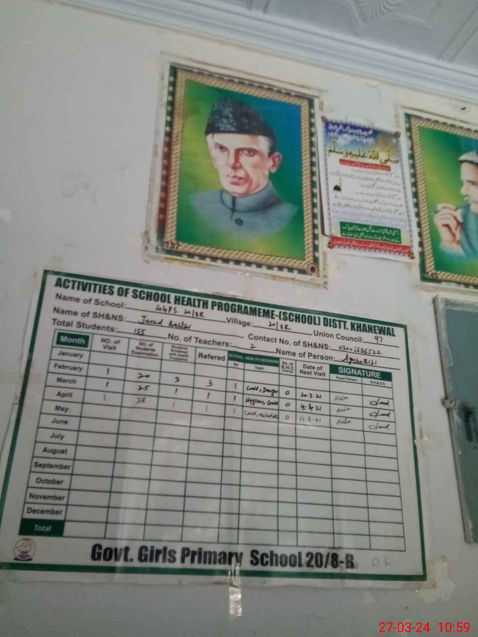 | School Visited by School Health & Nutrition Supervisor (No. of Visits) | 1 | Name1: | Javed Akhtar | Name2: | Nil |