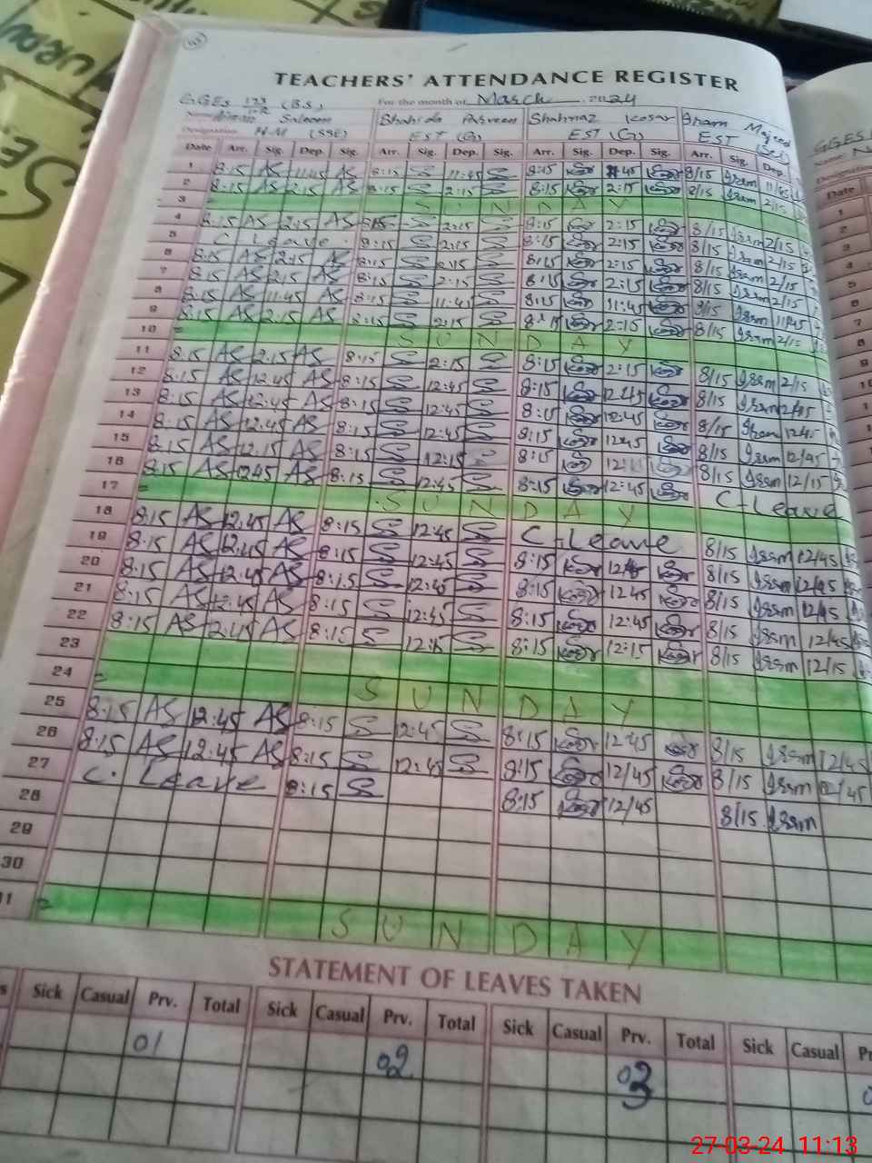 | Leave | Duty | Absent | Maternity | Medical | Ex- Pak |