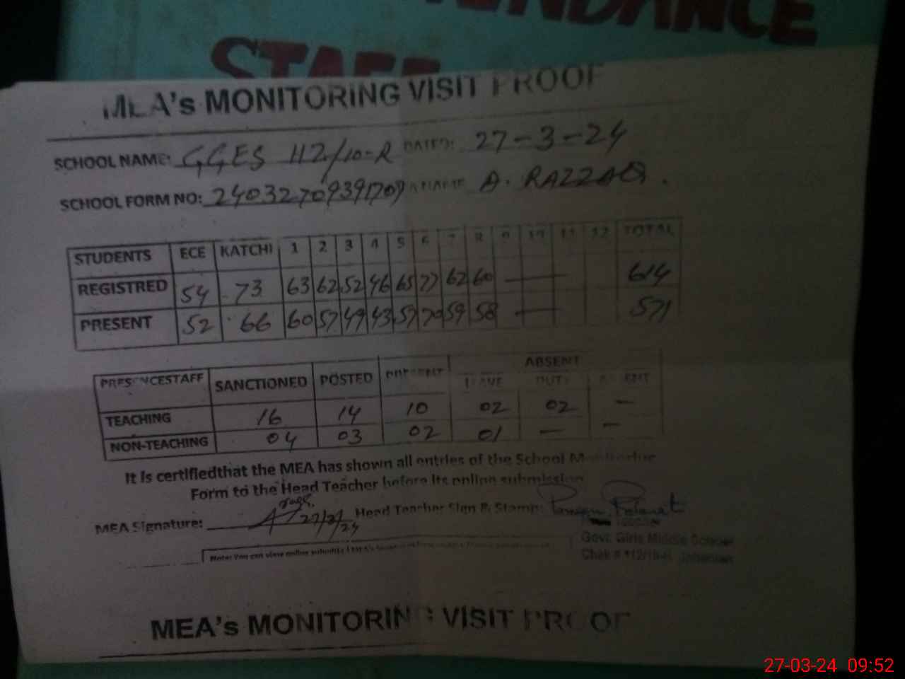 | Attendance Register | Head Teacher | MEA with School | Visit Proof |