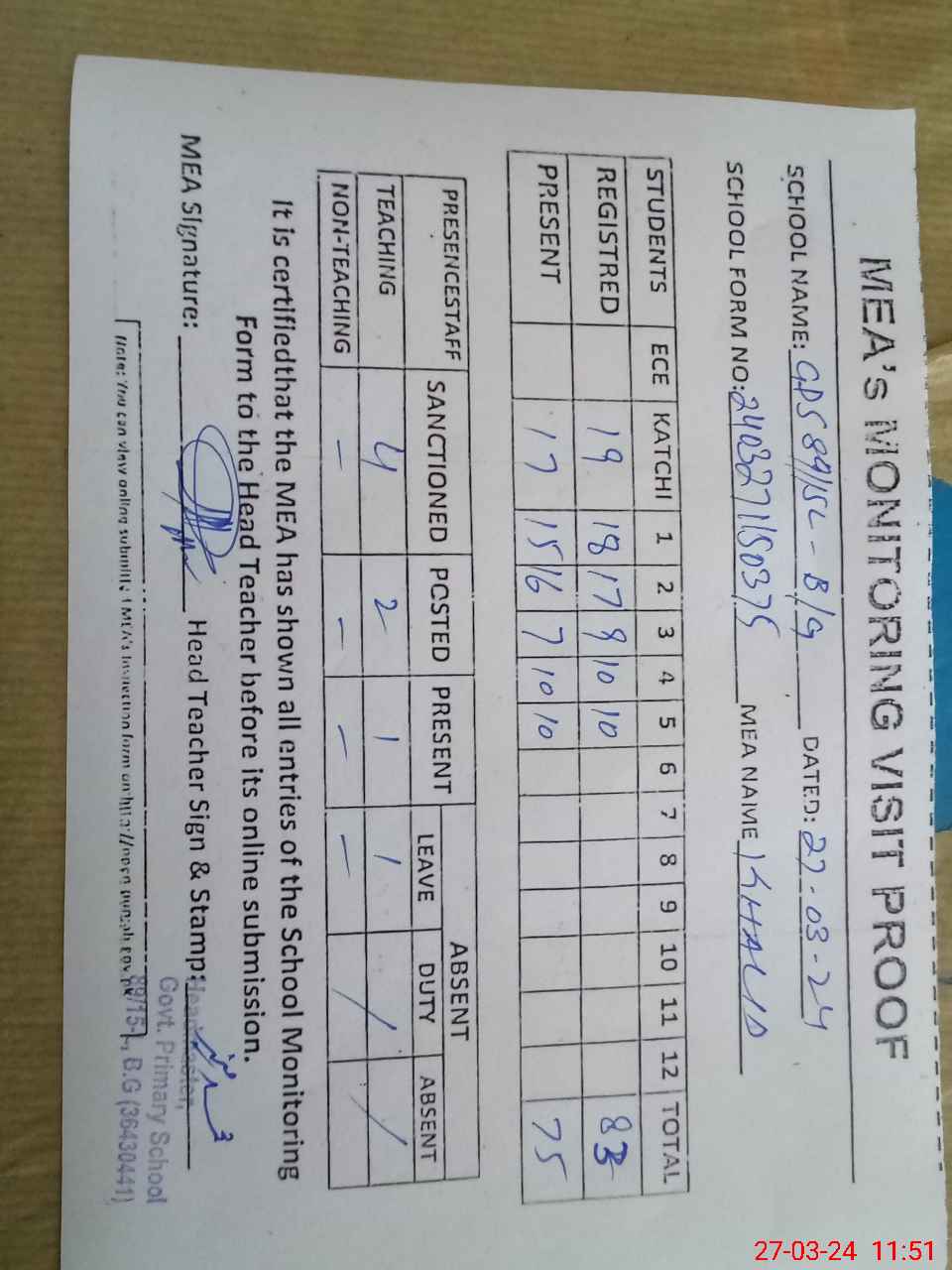 | Attendance Register | Head Teacher | MEA with School | Visit Proof |