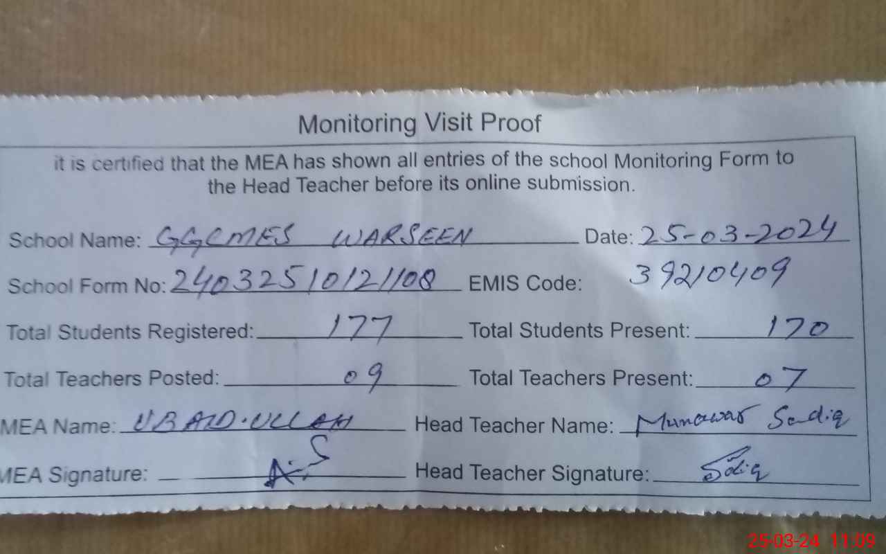 | Attendance Register | Head Teacher | MEA with School | Visit Proof |