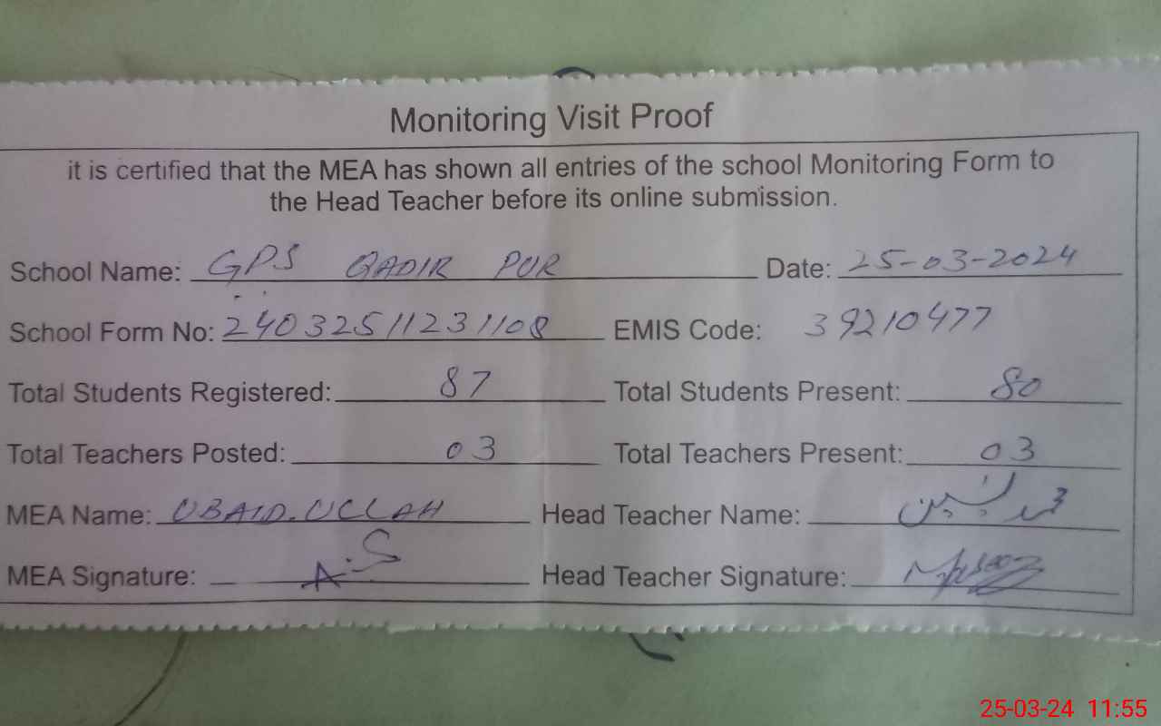 | EMIS Code: 39210477 | Name of School: GPS QADIR PUR | |||