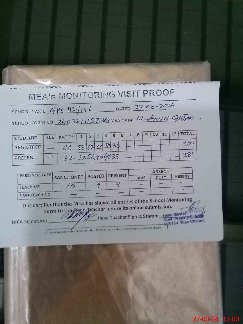 | EMIS Code: 36430212 | Name of School: GPS 112/15-L, MIAN CHANNU | |||