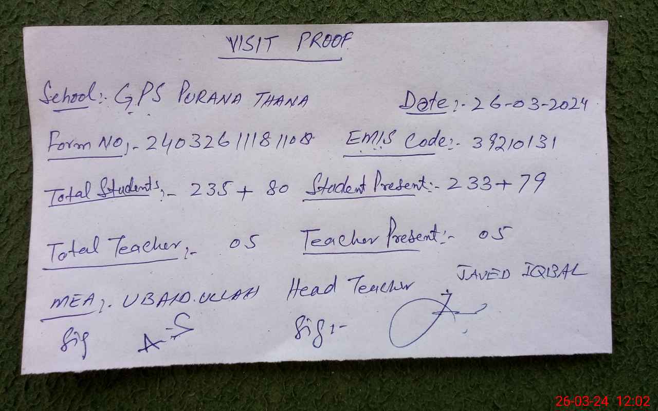 | EMIS Code: 39210131 | Name of School: GPS PURANA THANA | |||