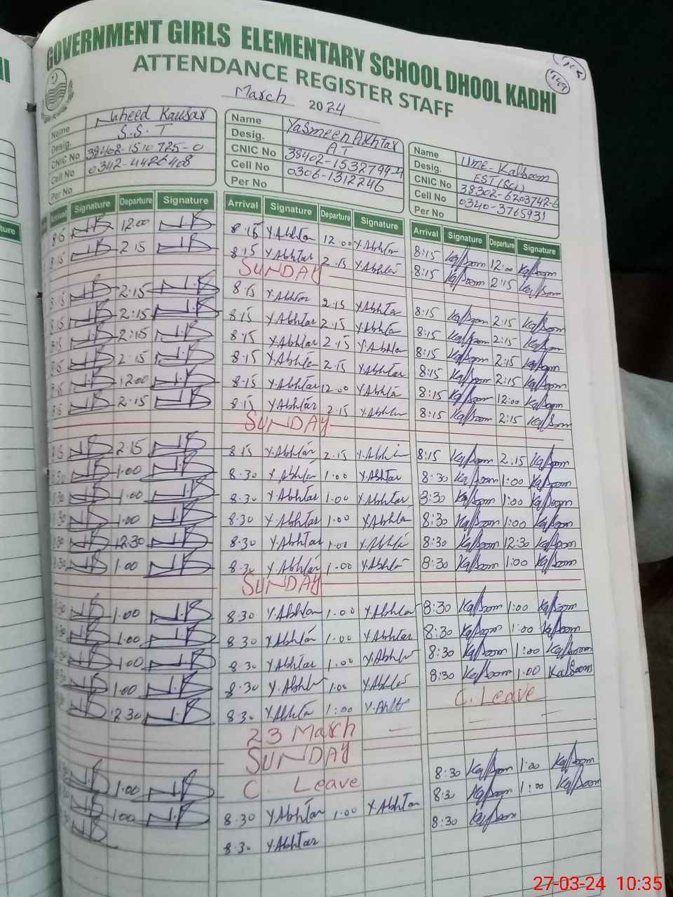 | CNIC | Full Name | Designation | R/C | Absence During Last Calender Month |