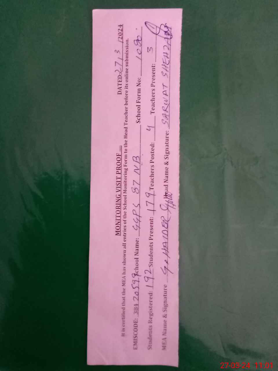| Attendance Register | Head Teacher | MEA with School | Visit Proof |
