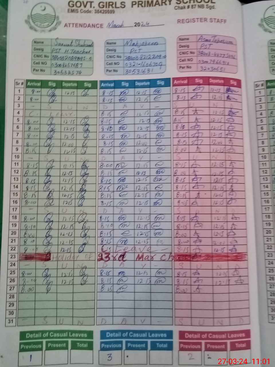 | CNIC | Full Name | Designation | R/C | Absence During Last Calender Month |