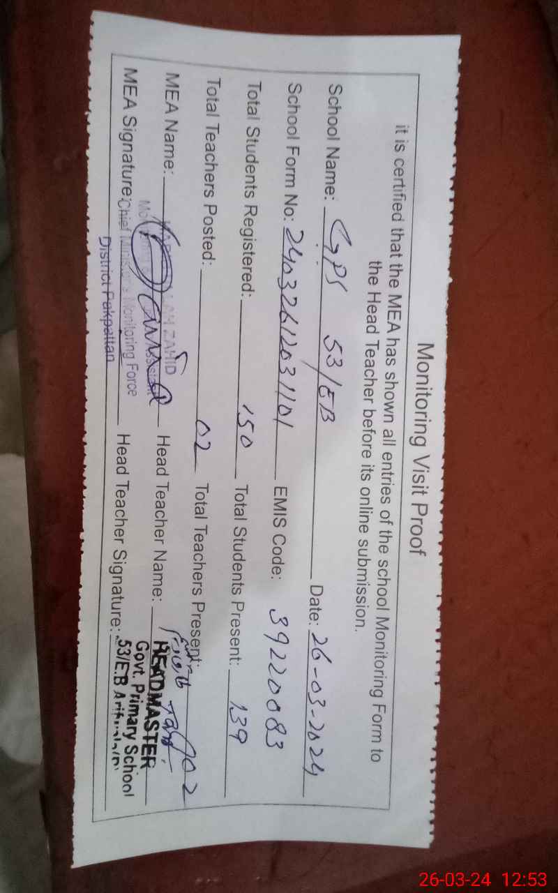 | EMIS Code: 39220083 | Name of School: GPS 53 EB P/O ARIF WALA | |||