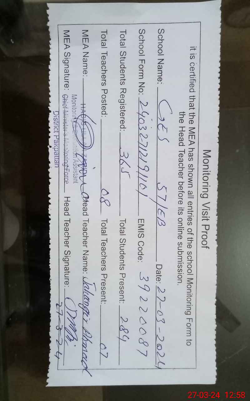 | Certified that this School was Inspected by the Undersigned MEA/DMO Today and the Information Stated Above is as Per Record. | |||||