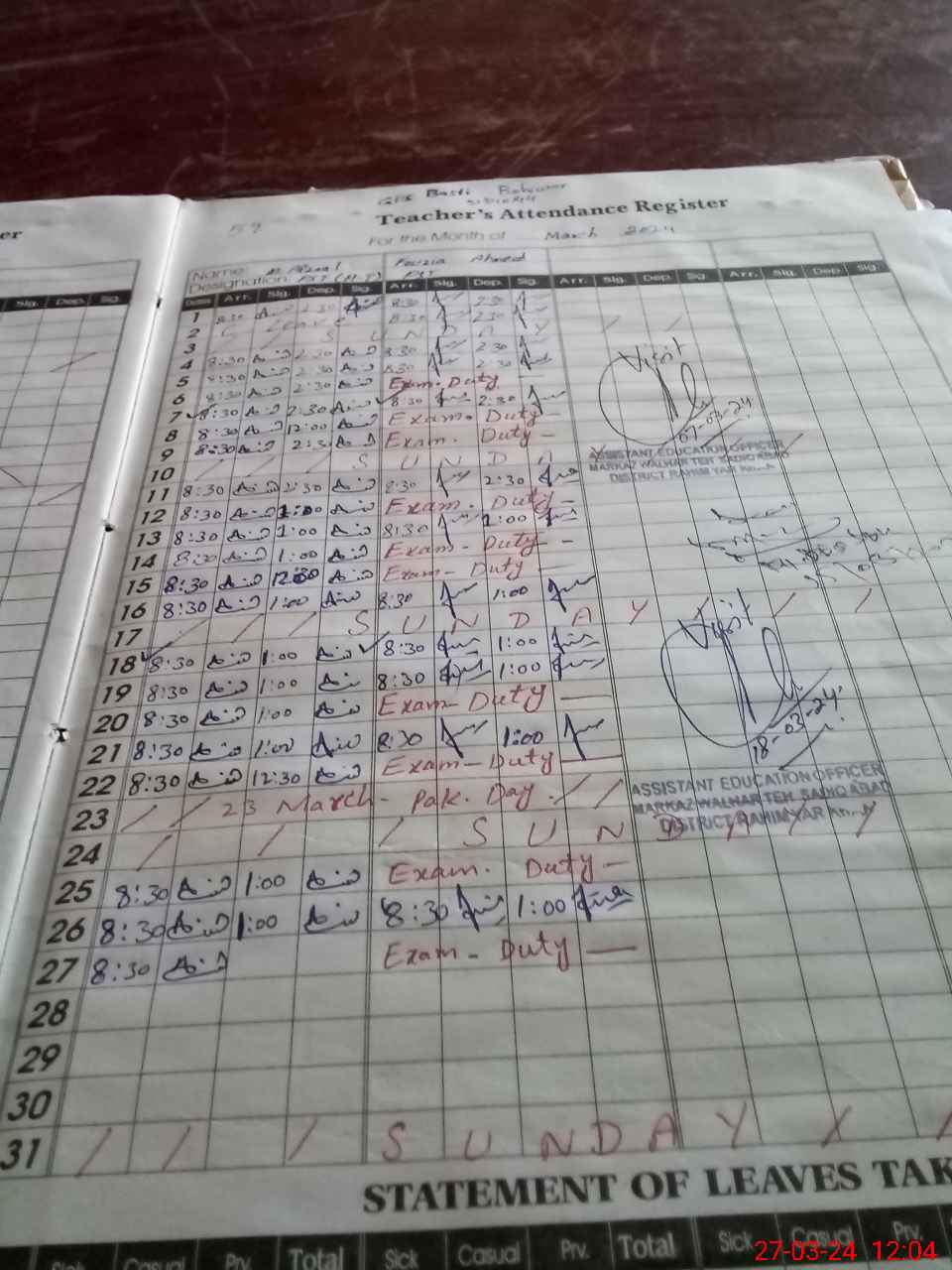 | Leave | Duty | Absent | Maternity | Medical | Ex- Pak |
