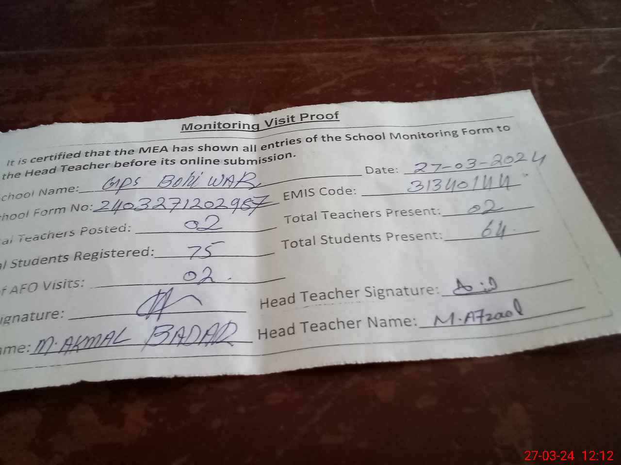 | Attendance Register | Head Teacher | MEA with School | Visit Proof |