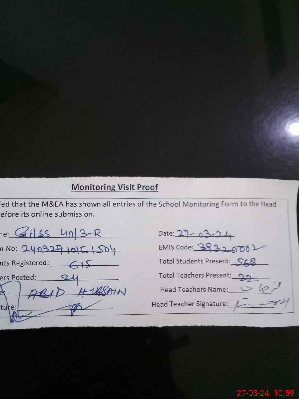 | Attendance Register | Head Teacher | MEA with School | Visit Proof |