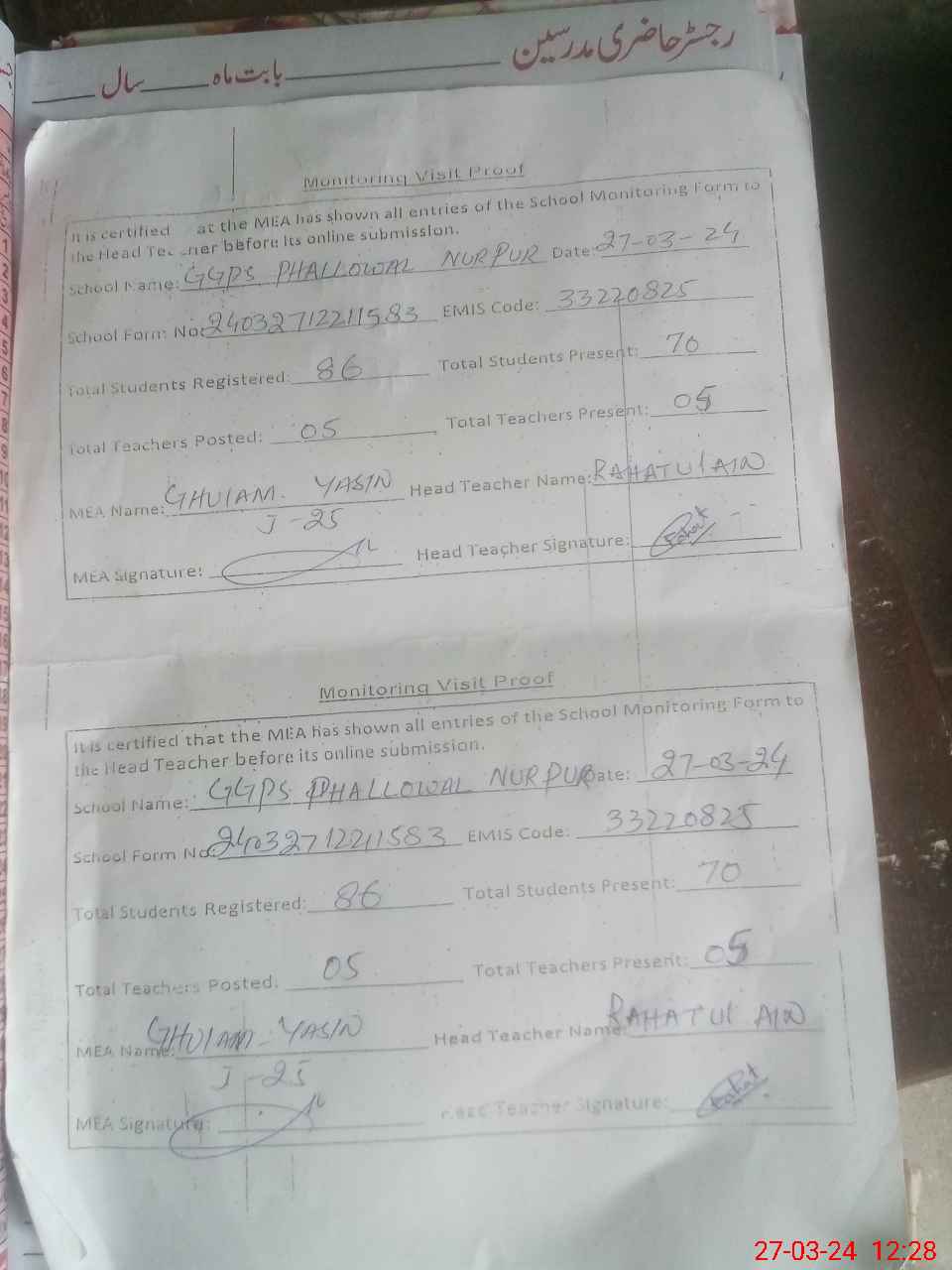 | Attendance Register | Head Teacher | MEA with School | Visit Proof |