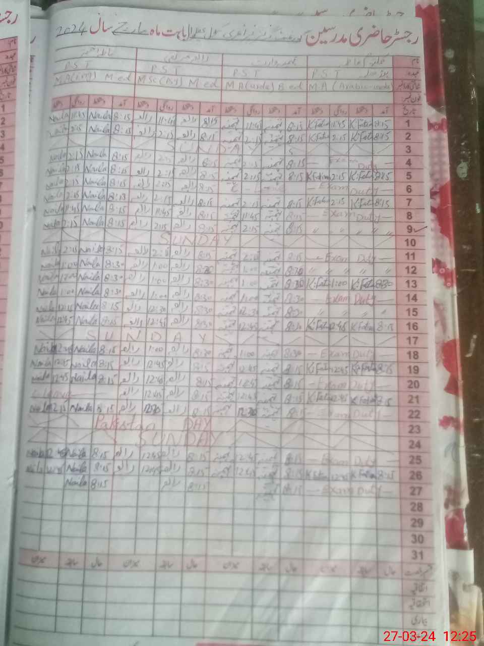 | 33**** | Ka**** Fa**** | PST | Regular | 0 | 0 | 0 | 0 | 0 | 0 | 0 | 0 | 0 | Exam Duty |
