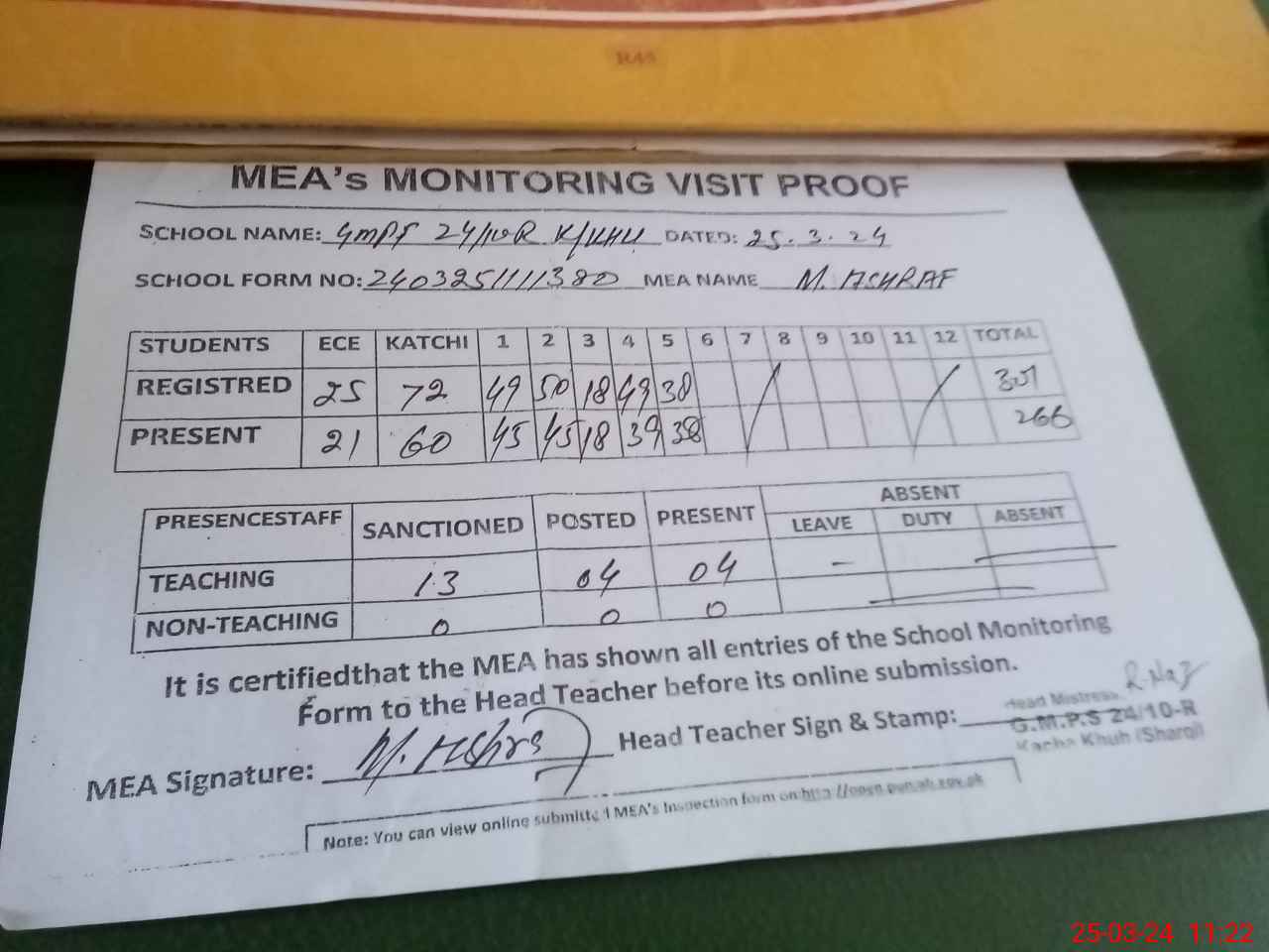 | Attendance Register | Head Teacher | MEA with School | Visit Proof |