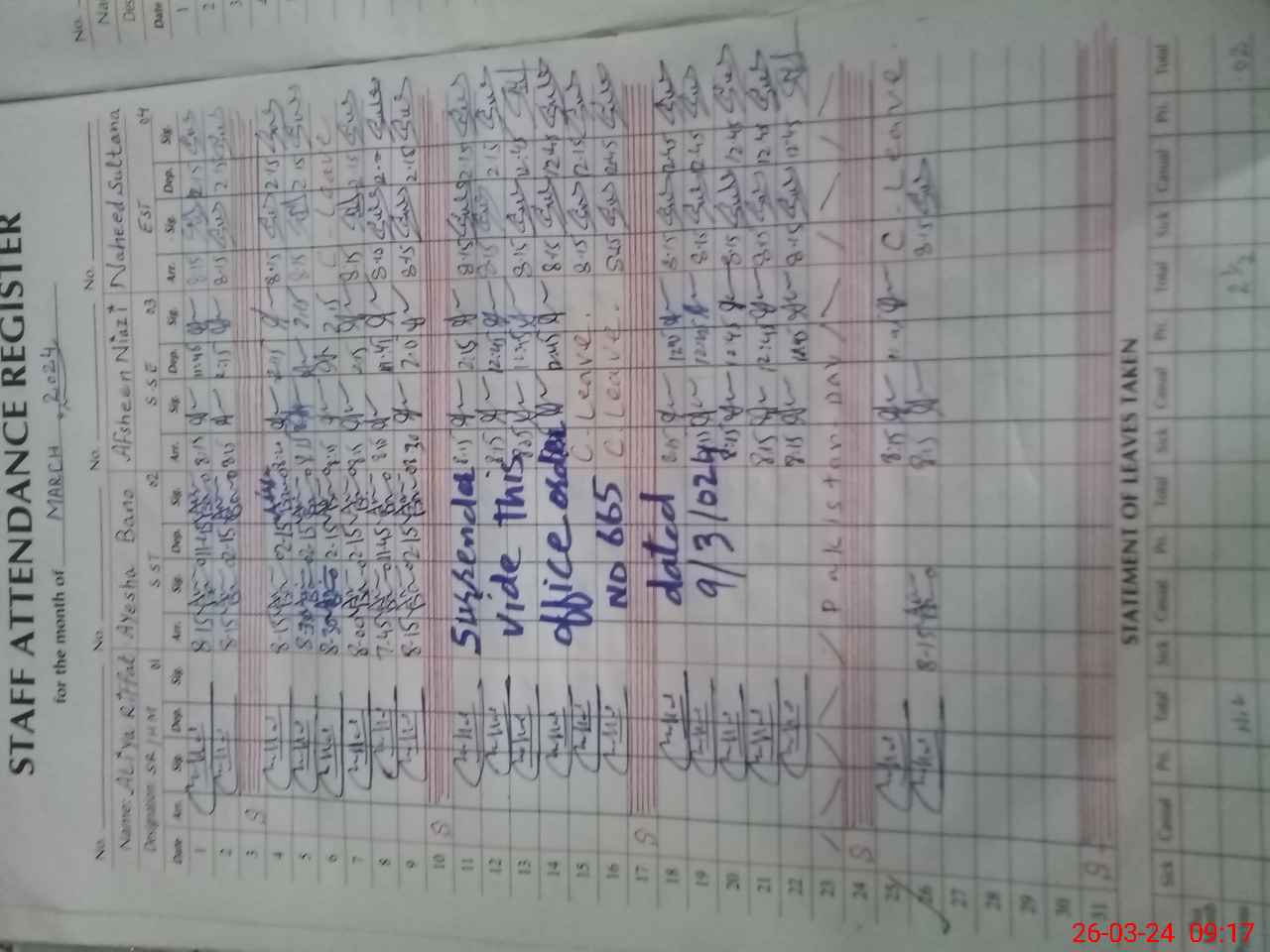 | Leave | Duty | Absent | Maternity | Medical | Ex- Pak |
