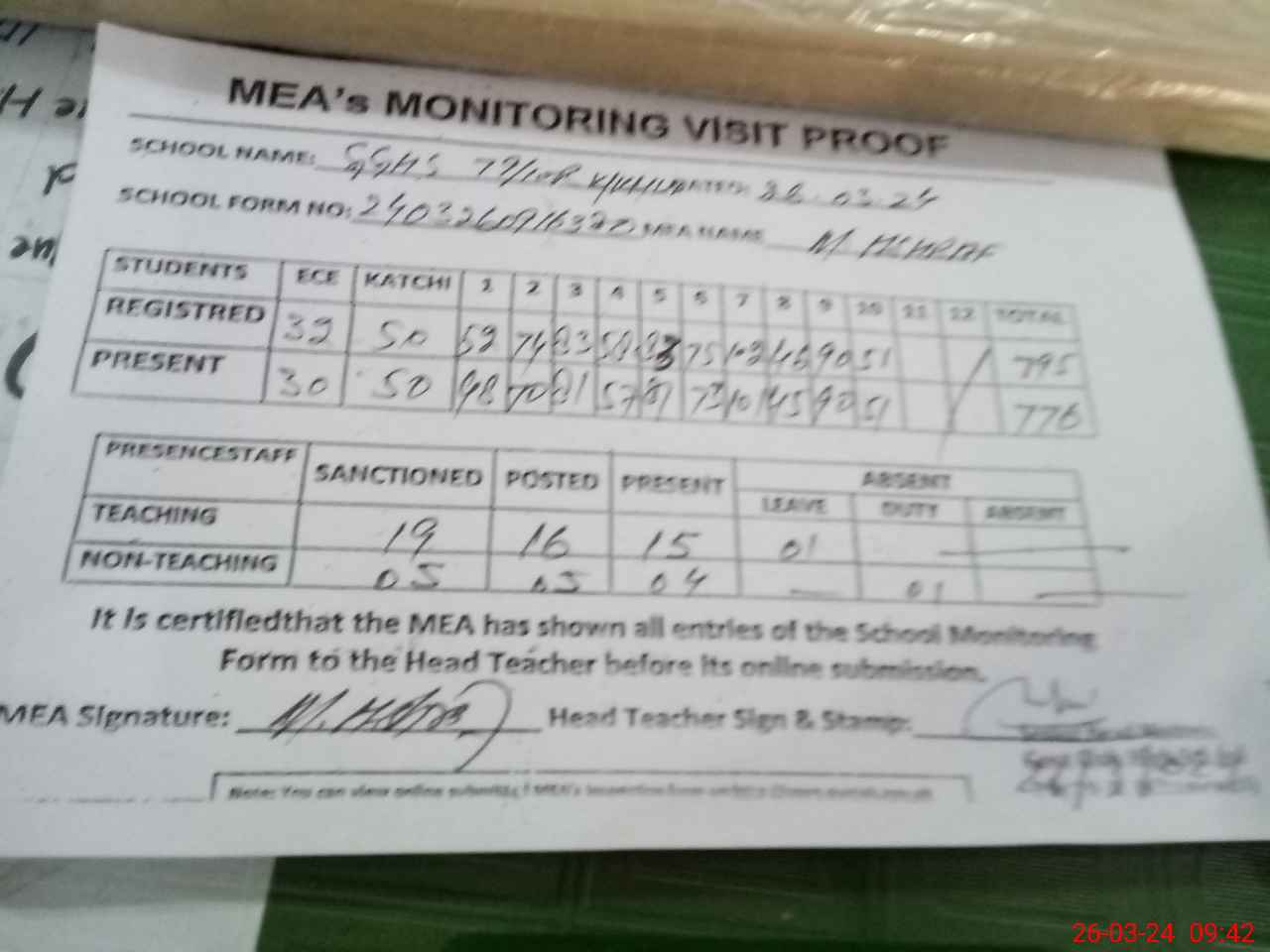 | Attendance Register | Head Teacher | MEA with School | Visit Proof |