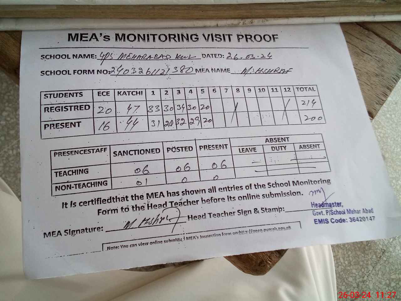 | EMIS Code: 36420147 | Name of School: GPS MEHAR ABAD, KHANEWAL | |||