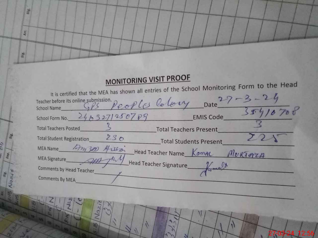 | Attendance Register | Head Teacher | MEA with School | Visit Proof |