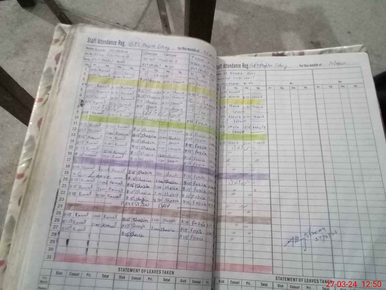 | Leave | Duty | Absent | Maternity | Medical | Ex- Pak |