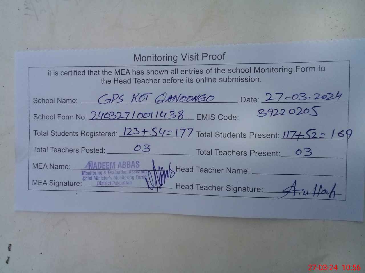 | Attendance Register | Head Teacher | MEA with School | Visit Proof |