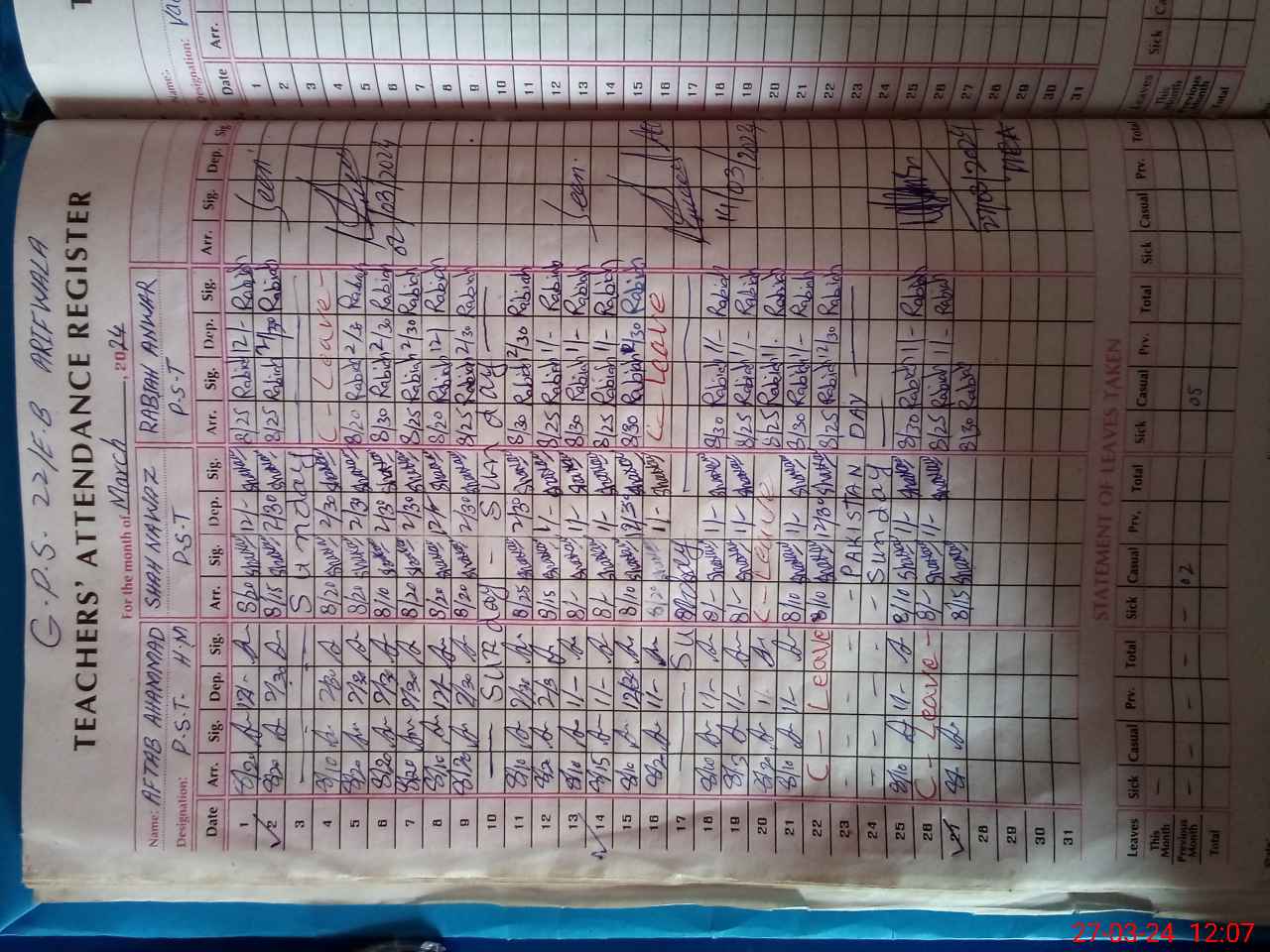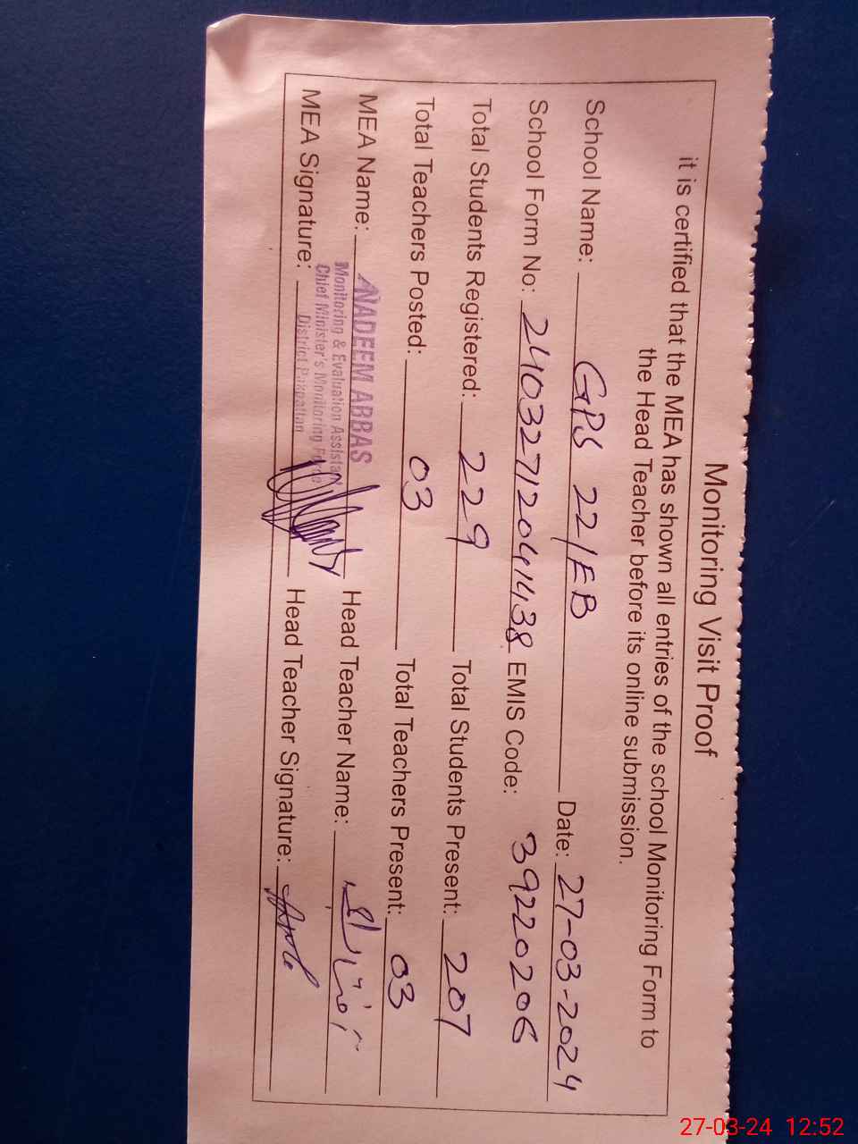 | Name: AF**** AH**** Designation: (School Headmaster's/Headmistress's) PST Phone/Cell Number: 03**** |
