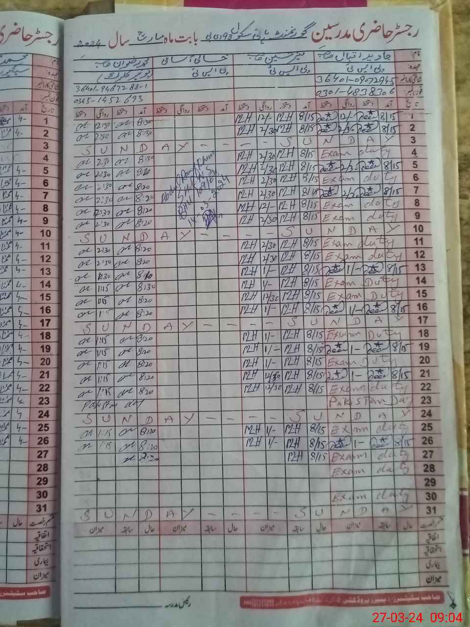 | 36**** | Ja**** Iq**** | PST | Regular | 1 | 0 | 0 | 0 | 0 | 0 | 0 | 0 | 1 | Exam Duty |