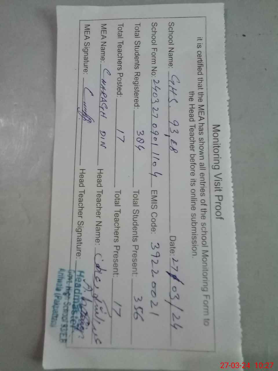| EMIS Code: 39220021 | Name of School: GHS 93/E-B TEH ARIF WALA | |||