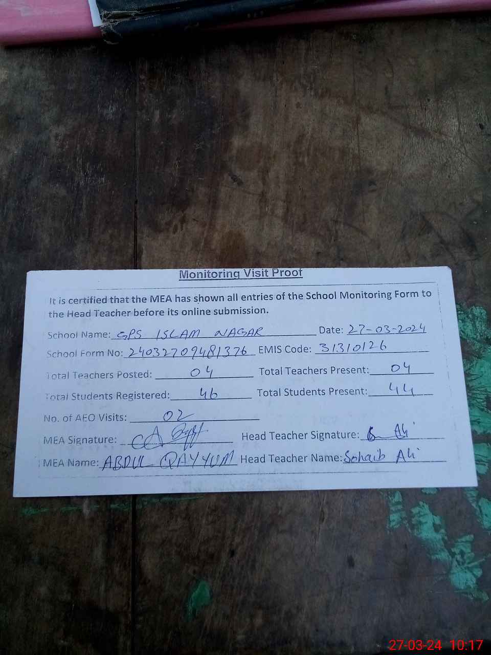 | Attendance Register | Head Teacher | MEA with School | Visit Proof |