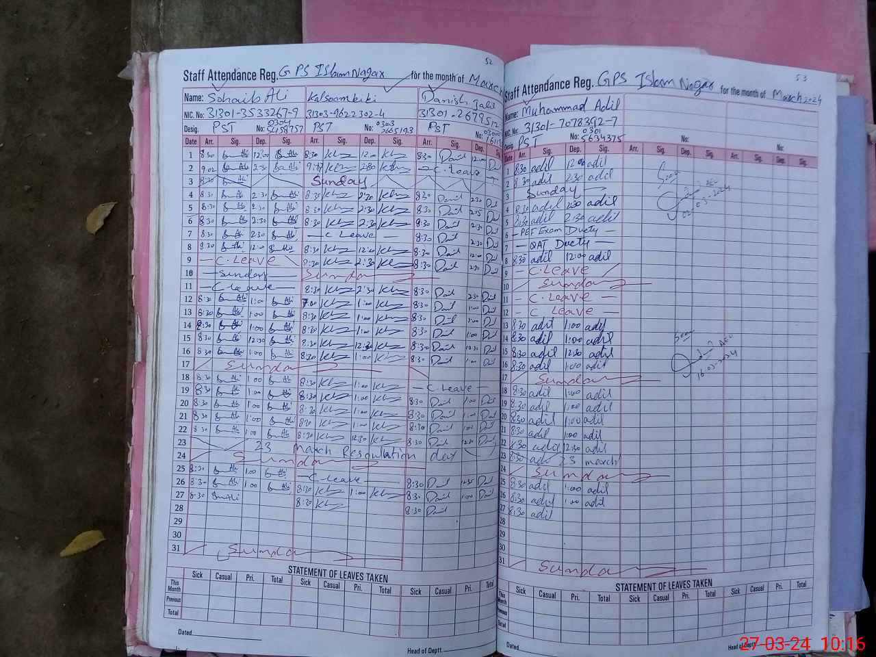 | CNIC | Full Name | Designation | R/C | Absence During Last Calender Month |