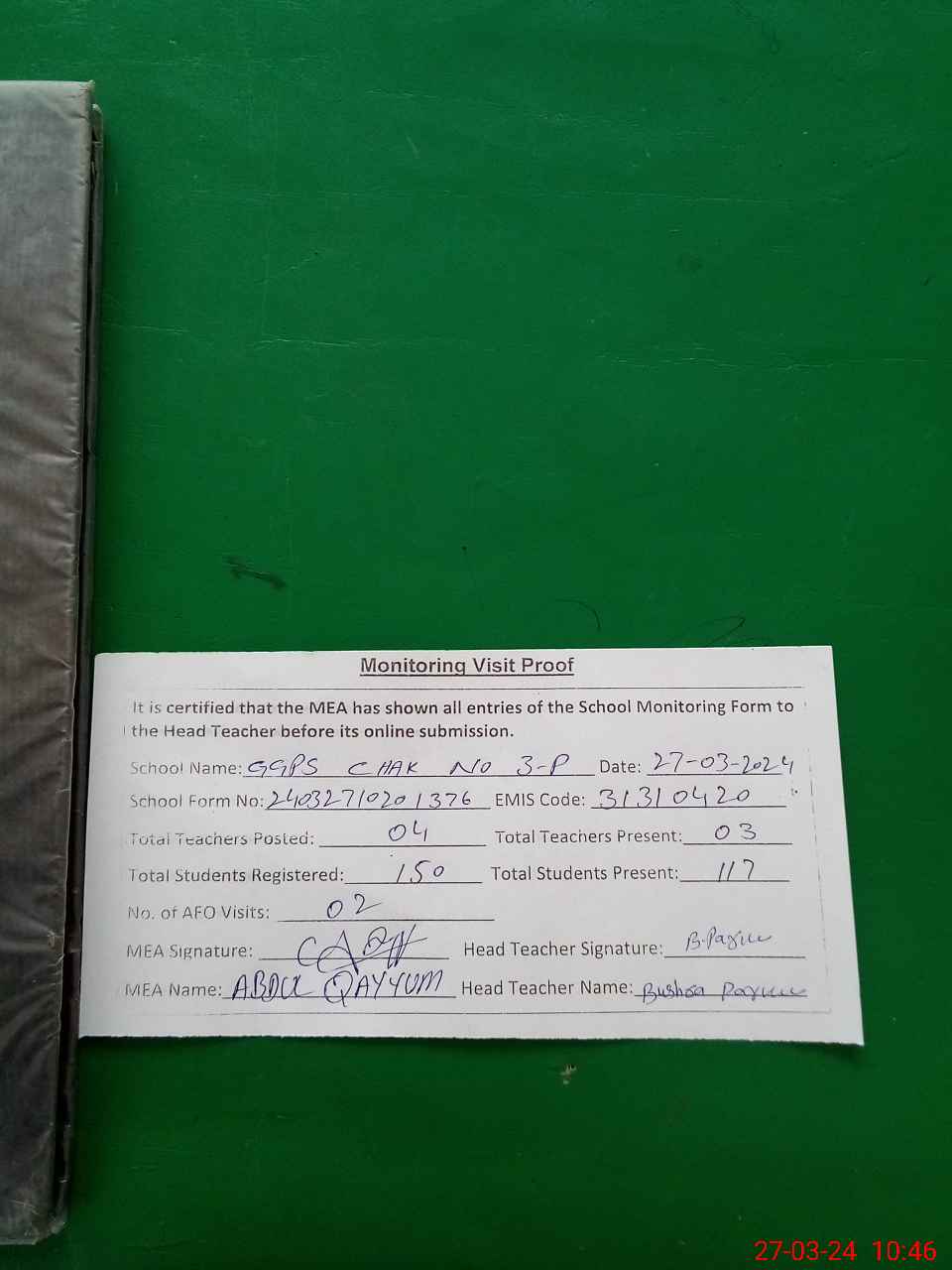 | Attendance Register | Head Teacher | MEA with School | Visit Proof |