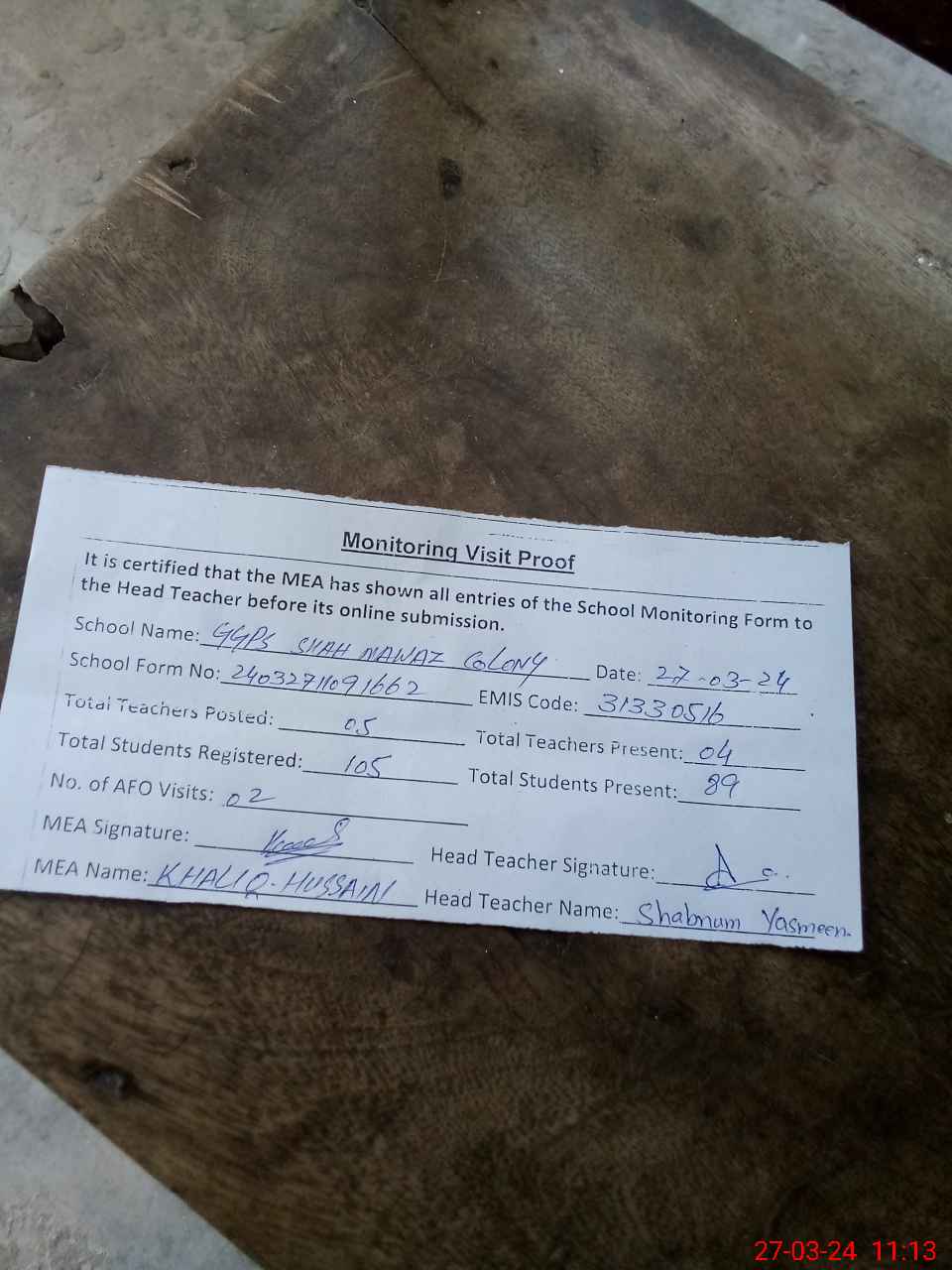 | EMIS Code: 31330516 | Name of School: GGPS SHAH NAWAZ COLONY | |||