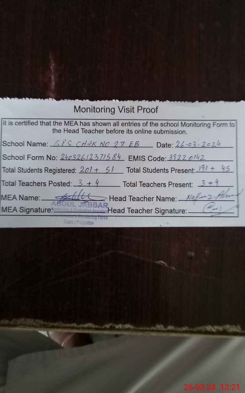 | EMIS Code: 39220142 | Name of School: GPS CHAK NO. 27 EB | |||