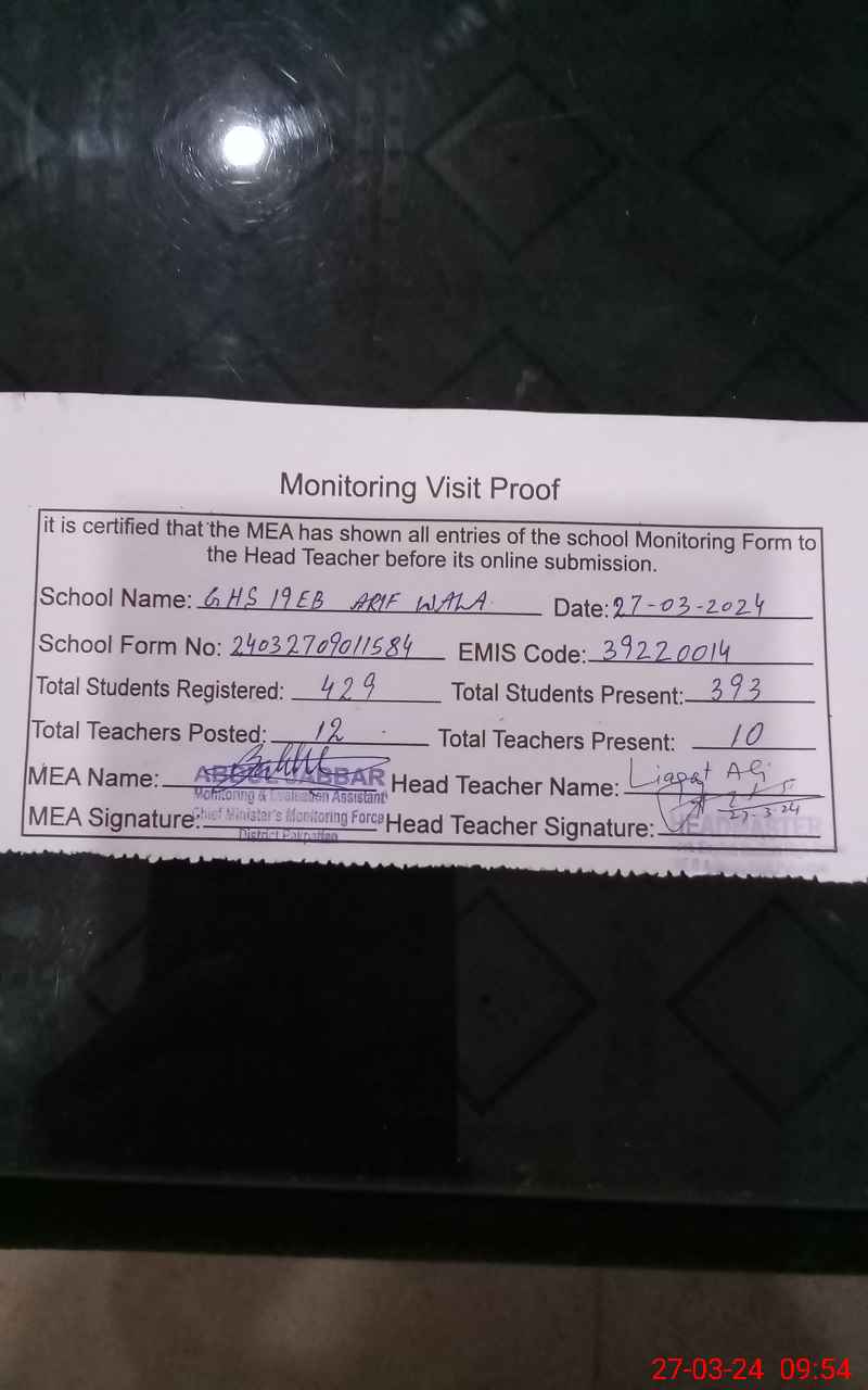 | EMIS Code: 39220014 | Name of School: GHS 19 EB ARIFWALA | |||